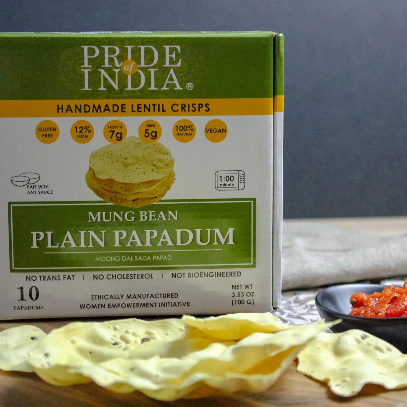 At pride of india, we have a century long tradition of consuming pure and healthy foods directly from farms to our tables. We source the freshest ingredients that are naturally and sustainably cultivated in order to enhance the overall health of the human body. Our papadums (poppadoms or papad) are handmade with nutrient rich lentils and spices that are cultivated in humid and temperate areas of india. These sun-dried lentil crisps are light, easy to digest, fast to cook.